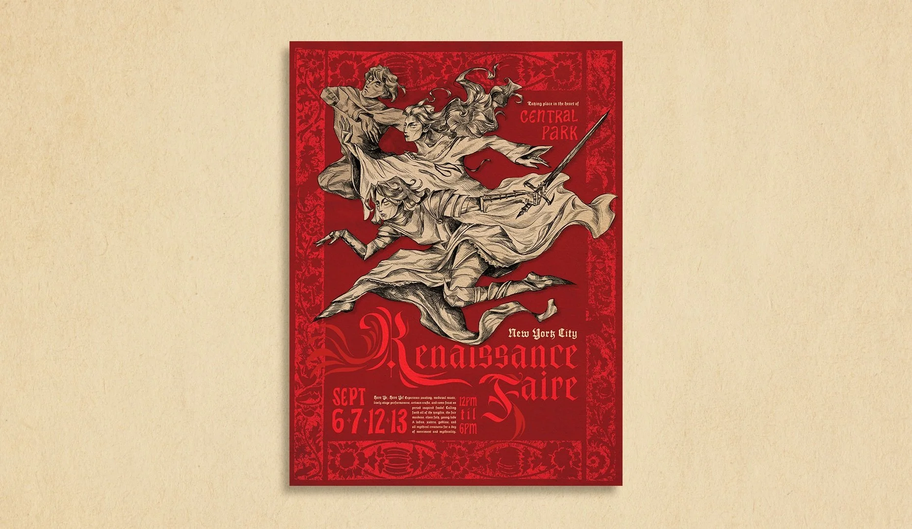 I created illustration-based mock branding for the New York City Renaissance Faire. I incorporated my own illustration with a variety of Blackletter and Gothic fonts and patterns to embody the historical charm of the medieval to emphasize the event’s theme of bridging the gap between past and present in a magical and exciting way.